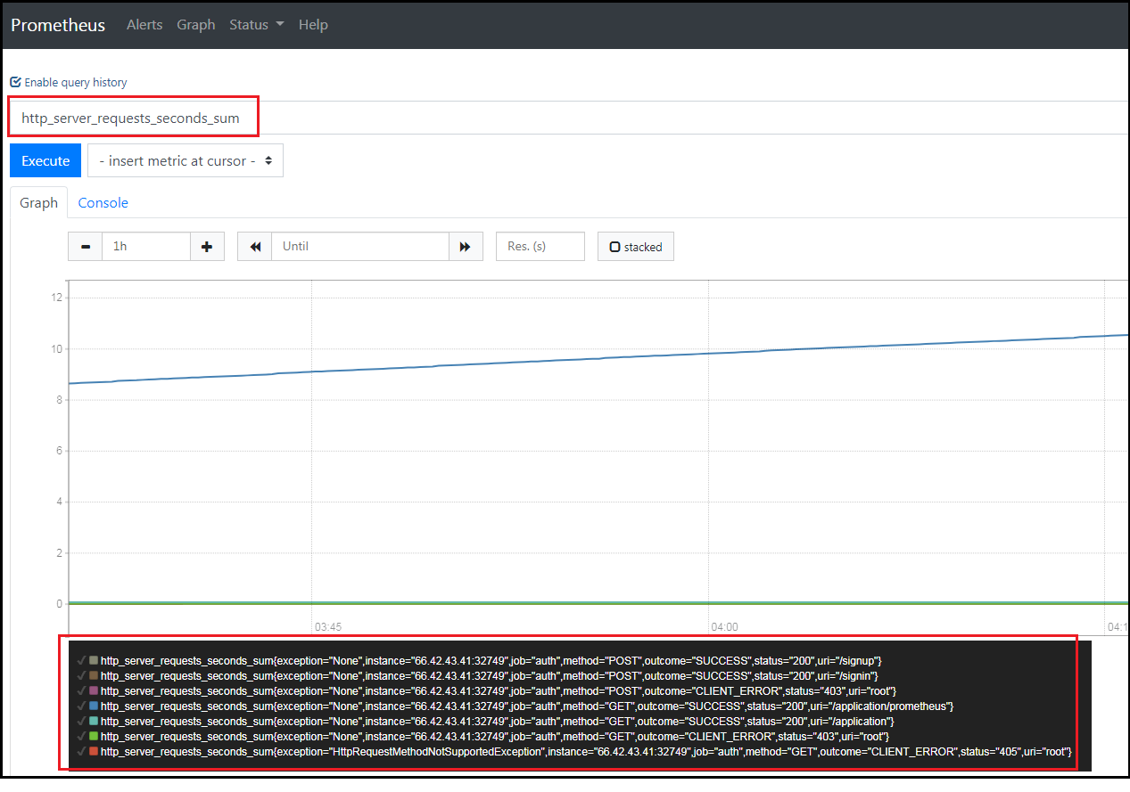 그리고 프로메테우스 웹페이지에서 스프링부트 애플리케이션 관련 PromQL을 입력하면 다음과 같이 uri별로 지표정보가 수집되는 것을 확인할 수 있다.