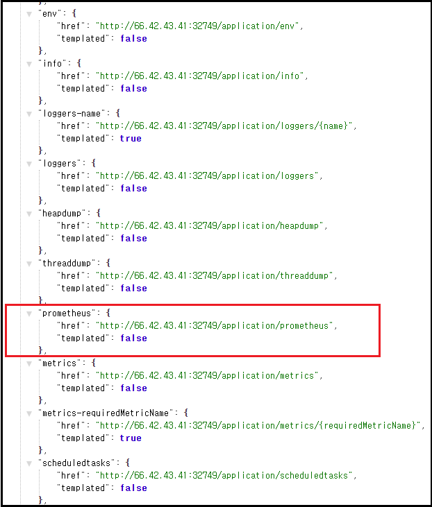 그리고 http://[호스트IP]:8080/application 으로 들어가보면 다음과 같이 prometheus 정보가 Actuator에 추가된 것을 확인할 수 있다(필자의 서버 ip는 66.42.43.41이고 스프링부트 애플리케이션가 구동된 컨테이너 포트가 32749였기 때문에, http://66.42.43.41:32749/application으로 접속하여 확인하였다).