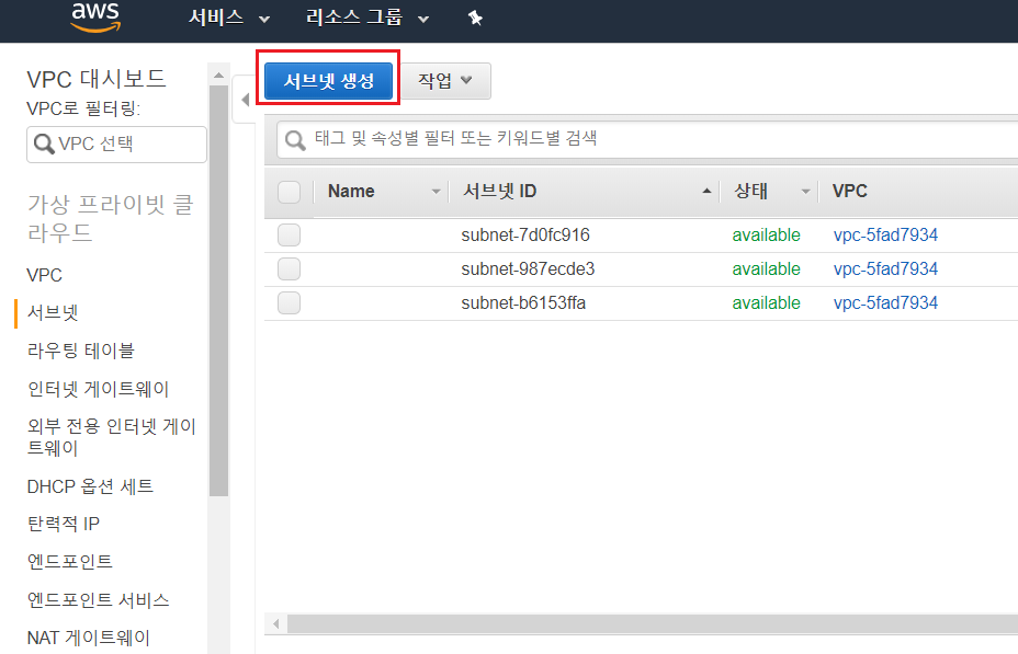 서브넷 생성 버튼을 클릭한다.
