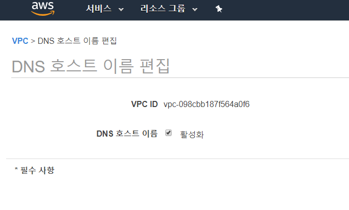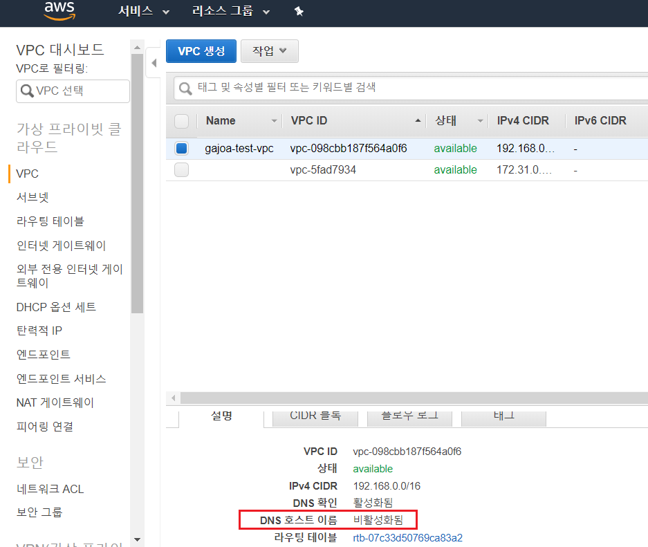 생성이 완료되면 리스트에서 확인 가능하다. 그런데 아래 그림을 보면 DNS확인(DNS 호스트네임을 IP로 해석할 때 AWS에서 제공하는 DNS 서버를 사용하는 기능)은 활성화 되어있는데, DNS 호스트 이름(VPC내부에서 생성되는 인스턴스에 퍼블릭 DNS 호스트네임을 할당해주는 기능)이 비활성화 된 것을 확인할 수 있다. 해당 값도 작업->DNS 호스트 이름 편집에서 활성화 시켜준다.
