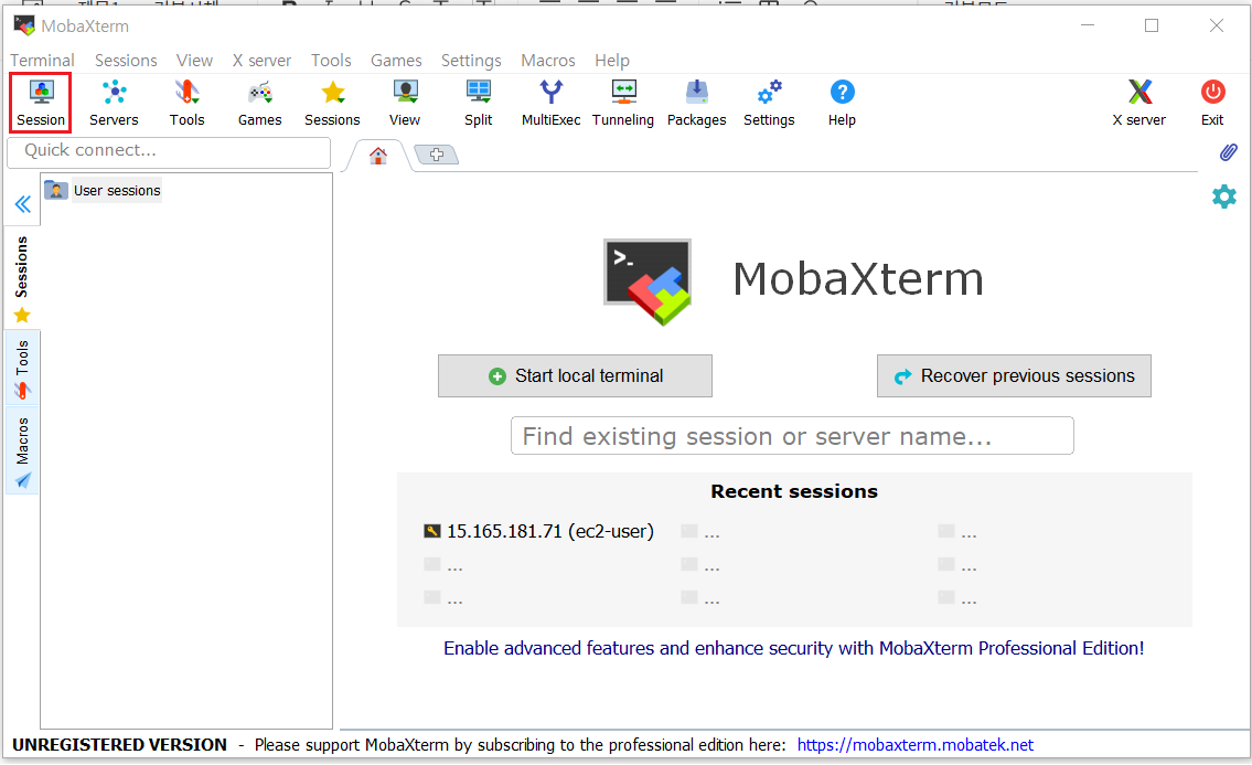 MobaXterm free버전을 다운로드 받고 실행 후 Session을 선택한다.