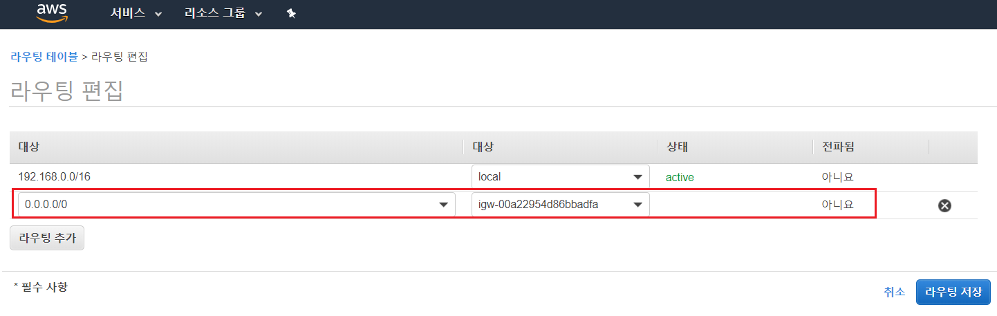 대상은 0.0.0.0/0을 선택하고 대상은 방금 전 만든 인터넷 게이트웨이 ID값을 입력한다. 라우트 규칙은 위에서부터 차례대로 적용된다. 첫 번째 규칙은 VPC CIDR 범위의 접근에 대해서 VPC 내부로 라우트하는 규칙이다. 두 번째 규칙은 그 이외의 모든 IP 접근(0.0.0.0/0은 모든 IP를 의미합니다)에 대해서 인터넷 게이트웨이로 라우트하는 규칙이다.