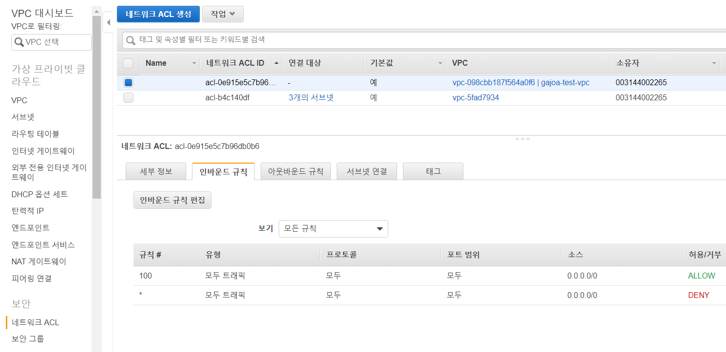 우선 네트워크 ACL은 서브넷 앞단에서 방화벽 역할을 하는 리소스다. VPC와 함께 생성되는 ACL은 인바운드 규칙과 아웃바운드 규칙이 각각 2개의 규칙을 가지고 있다. 규칙 번호가 높을수록 우선순위가 높은 규칙이며 *규칙은 어떤 규칙도 등록되지 않았을 경우 사용되는 규칙이다. 아래 규칙에서 보면 100 규칙이 존재하기 때문에 *규칙은 무시되며, 100규칙은 모든 트래픽을 허용하는 규칙이다.