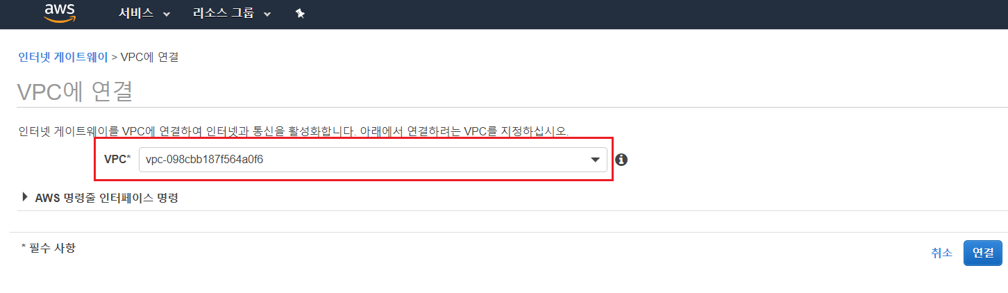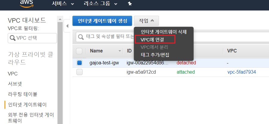 다음으로 작업->VPC연결을 선택하여 생성한 인터넷 게이트웨이와 VPC를 연결한다. VPC는 방금 전 만드 VPC를 선택한다.