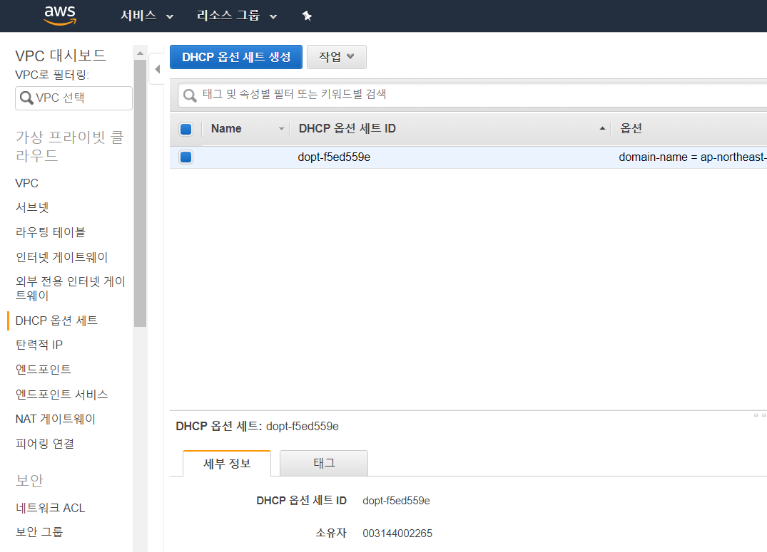 라우팅 테이블과 마찬가지로 DHCP 옵션세트도 자동으로 생성된다. DHCP 옵션 셋은 도메인 네임 서버, 도메인 네임, NTP 서버, NetBIOS 서버 등의 정보를 가지고 있으며, 보통은 기본값을 사용한다.
