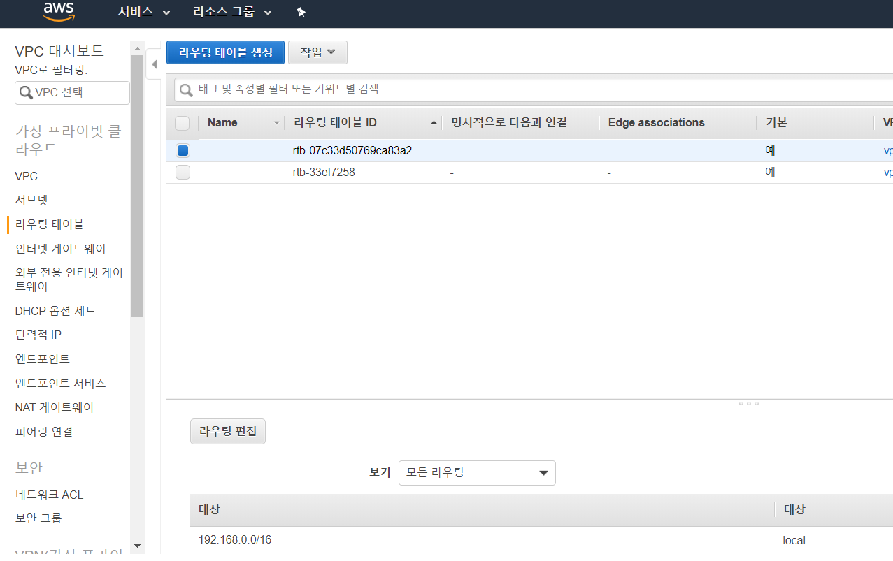 그러면 인터넷 게이트웨이 상태가 attached가 되면서 연결이 된다. 다음으로 서브넷의 라우팅 테이블이 인터넷 게이트웨이를 가르키도록 설정해보자. VPC->라우팅테이블로 가서 VPC를 만들때 생성된 라우팅 테이블을 선택한 후 라우팅 편집을 선택한다.