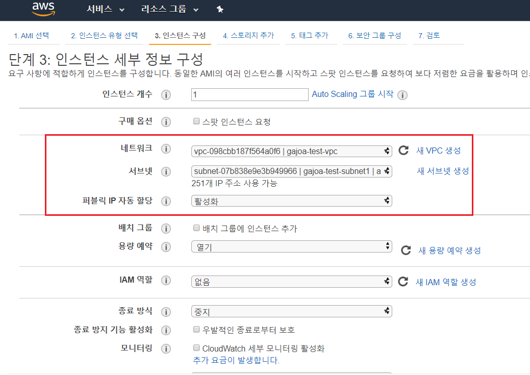 네트워크와 서브넷에 조금 전 생성한 VPC와 서브넷을 선택한다. 퍼블릭IP자동할당은 활성화를 선택한다(그래야 EC2 인스턴스를 만들었을 때 퍼블릭IP를 자동으로 할당받는다)