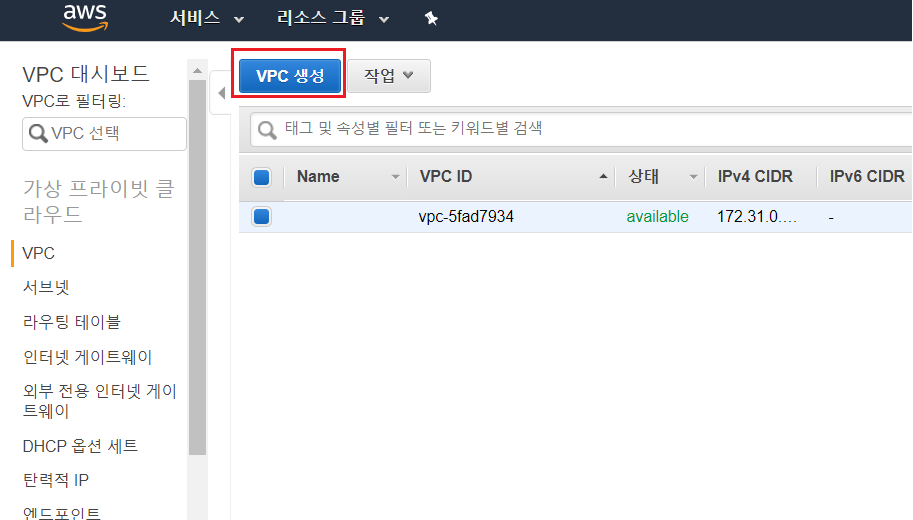 AWS 홈페이지로 가서 VPC로 들어간다. VPC에서 VPC생성 버튼을 클릭한다.