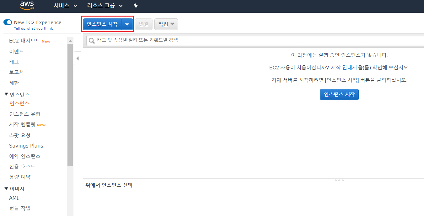 리소스에서 EC2를 검색한 후 인스턴스 시작 버튼을 클릭한다.