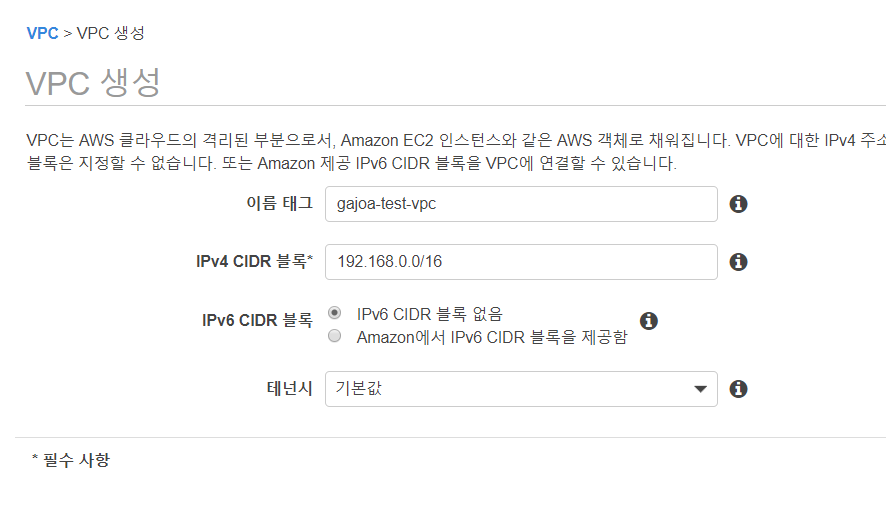 이름태그를 입력하고, IPv4 CIDR 블록을 입력한다. 공인망 대역과 겹치게 되면 나중에 외부 통신이 불가능한 경우가 생길 수 있으니 사설망 대역으로 작성하자. 사설망 대역은 10.0.0.0/8, 172.16.0.0/12, 192.168.0.0/16 이다(사설망 대역보다 작은 값은 등록 가능하다. 예를 들면 192.168.0.0/24로도 등록 가능하며, 192.168.1.0/24로도 등록 가능하다).