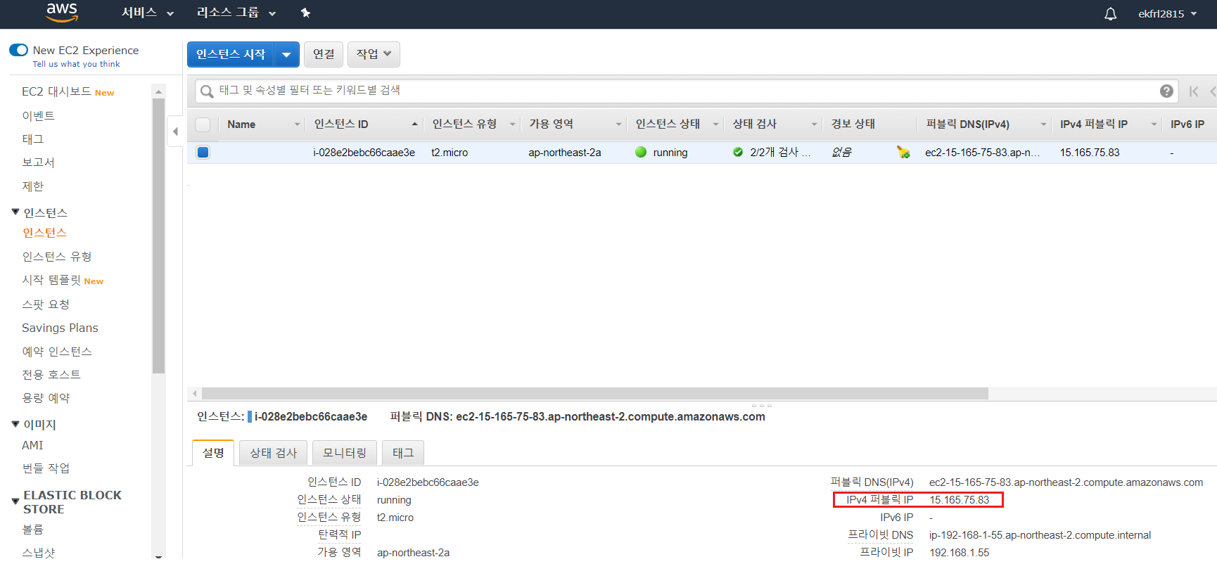 그러면 EC2 인스턴스가 실행되는 것을 확인할 수 있다. 처음에 실행중일 때는 pending 상태로 있다가 실행이 완료되면 running 상태로 변경된다. 우측 하단을 보면 IPv4 퍼블릭IP가 할당된 것을 확인할 수 있는데, 탄력적IP(Elastic IP)를 할당 받아서 해당 EC2 인스턴스에 할당시켜주지 않으면, 해당 EC2 인스턴스는 중지 후 재시작을 할 때마다 IP가 바뀌게 된다.