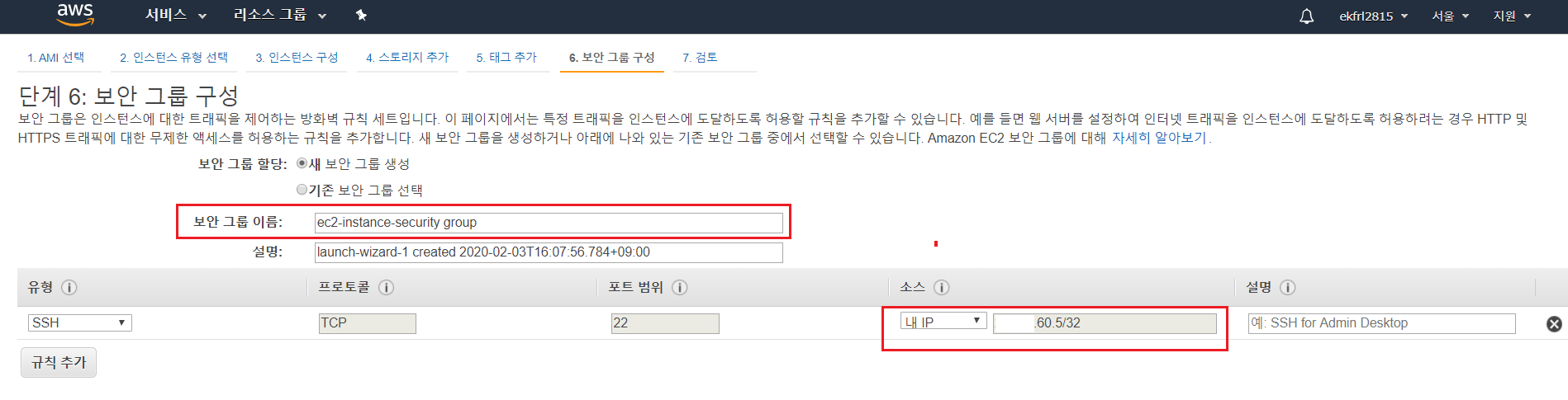 4. 스토리지 추가와 5. 태그추가는 기본으로 가고 6. 보안그룹구성은 SSH포트만 허용했으며 허용 조건은 현재 내 로컬PC의 IP만 등록했다(보안그룹구성은 기본적으로 SSH 포트로 유입되는 모든 트래픽을 허용되도록 등록되어 있다).