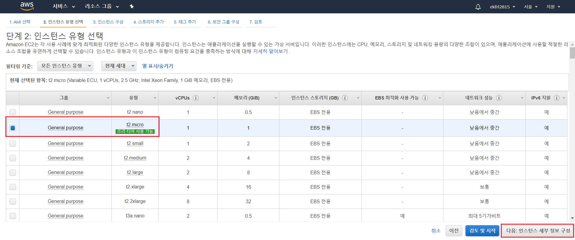 t2.micro(프리티어가 가능한 인스턴스)를 선택하고 인스턴스 세부 정보 구성을 누른다.