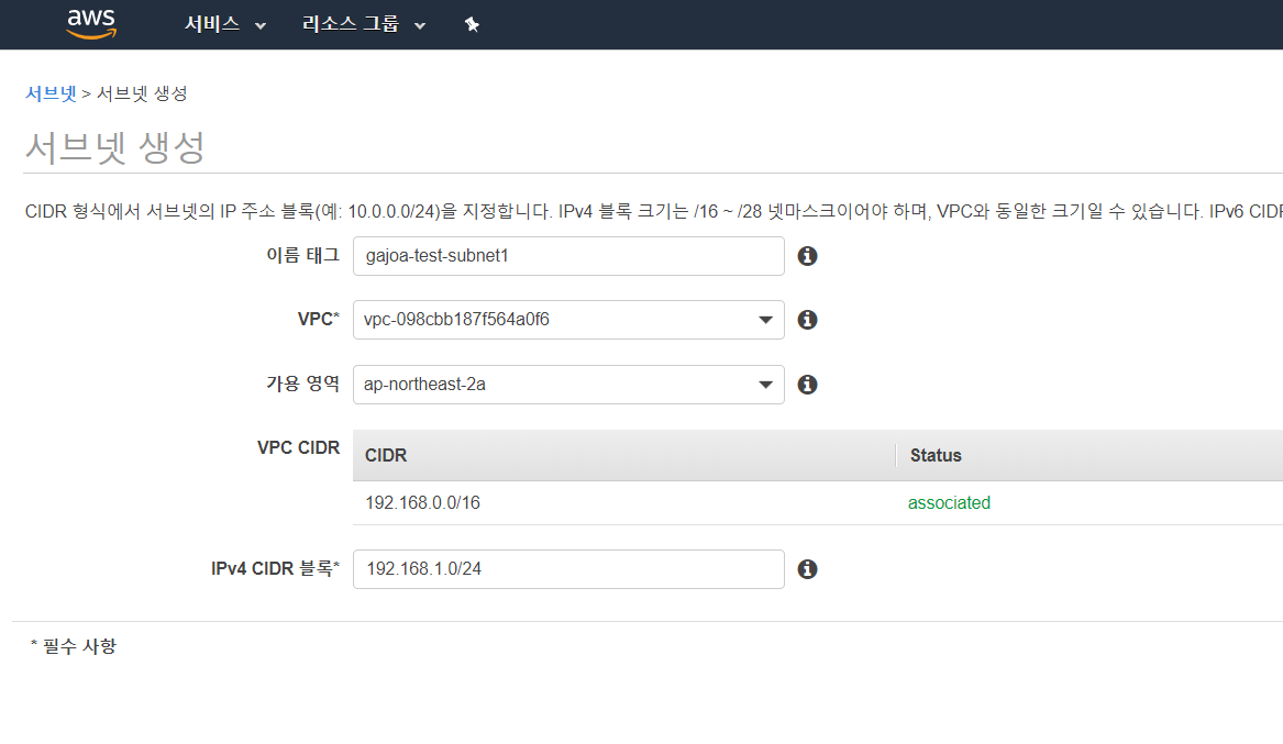 이름 태그와 VPC(조금 전에 생성한 VPC 선택)을 입력하고 가용영역을 선택한다. IPv4 CIDR은 VPC CIDR 범위에 포함되는 블록값을 입력한다.