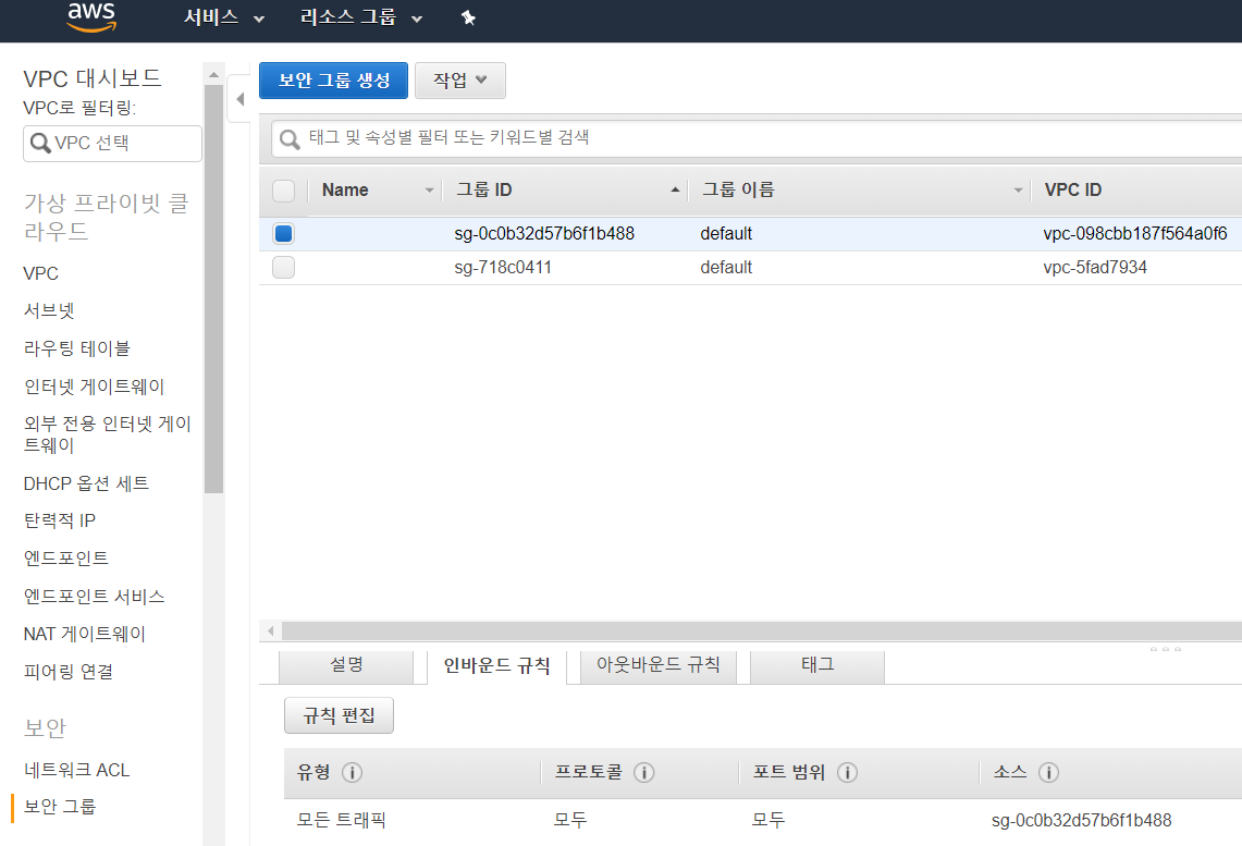 또한 VPC의 보안을 담당하는 네트워크 ACL과 보안그룹(Security group)도 생성된다.