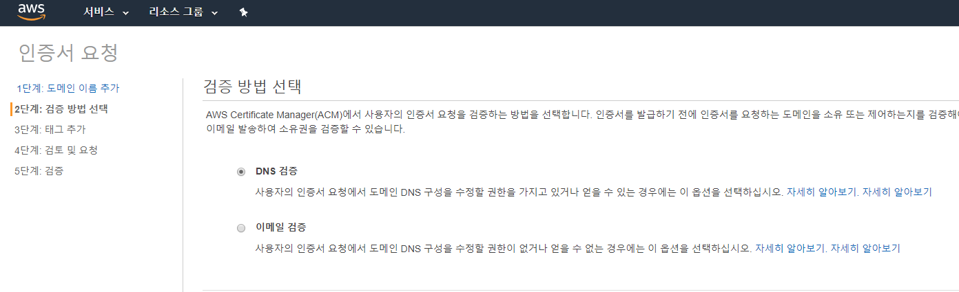 검증 방법 선택은 DNS검증을 선택한다.