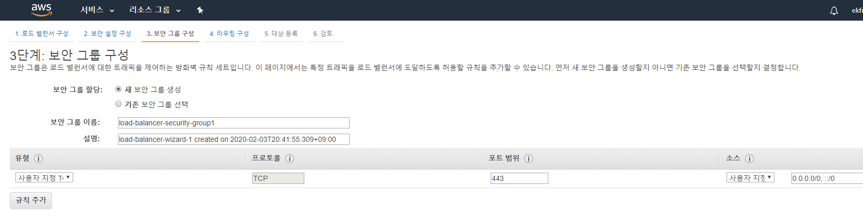 3단계 : 보안 그룹 구성에서는 보안그룹을 구성한다. 신규로 보안그룹을 한개 만들어주고 넘어가자.