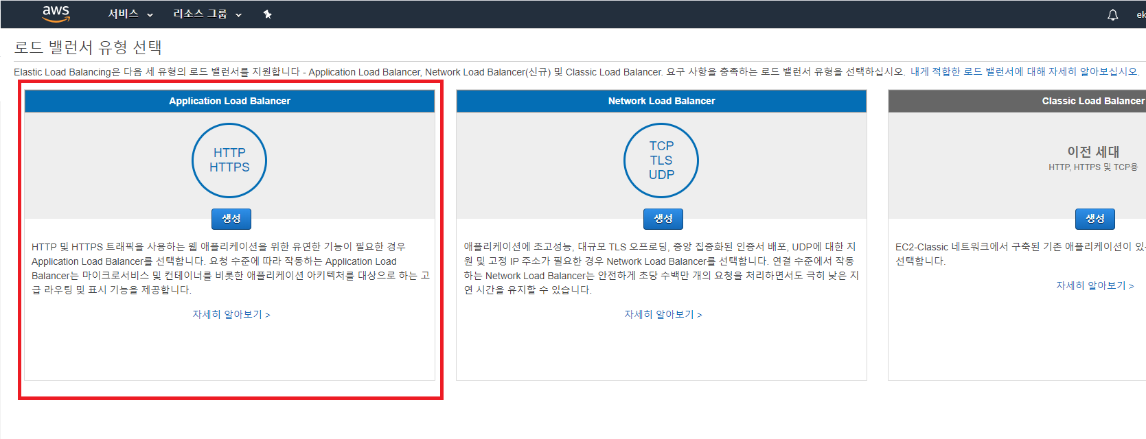 AWS 홈페이지에서 콘솔에 로그인-> EC2를 선택한 후 로드 밸런싱을 선택한 후 로드 밸런서 생성 버튼을 클릭한다.