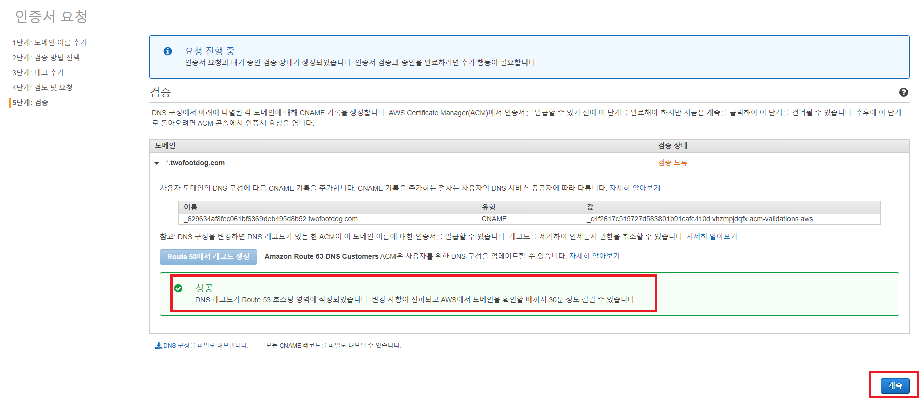 CNAME을 등록하면 DNS 레코드가 Route 53 호스팅 영역에 작성되었다고 메시지가 뜬다. 계속 버튼을 클릭한다.