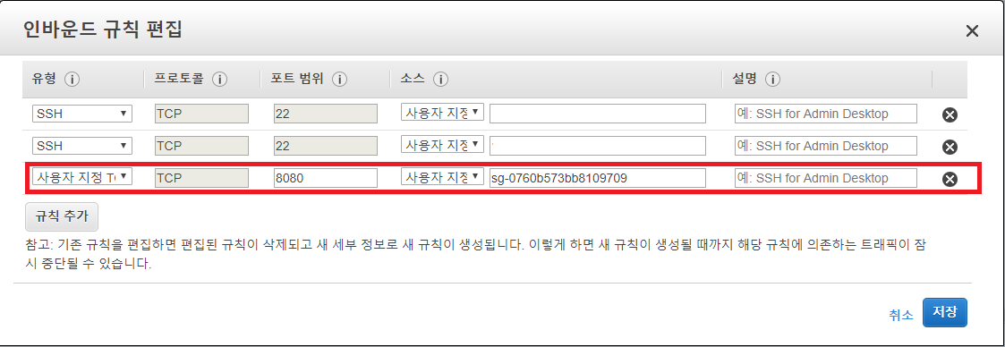 접속을 시도하면 접속이 되지 않는다. 왜그럴까? 이유는 바로 로드밸런서와 연결된 EC2의 보안그룹이 다르기 때문에 연결이 되지 않는다. 그렇기 때문에 EC2의 보안그룹 인바운드에 로드밸런서의 보안그룹을 등록해줘야 한다.