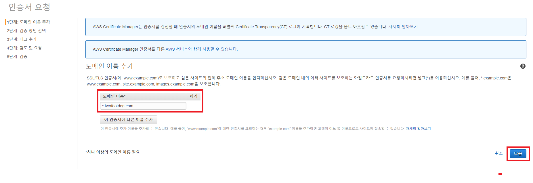 우선 인증서를 요청할 도메인 이름을 넣고 다음 버튼을 클릭한다(아래 그림에서는 *.twofootdog.com으로 등록했는데, 만약 도메인 명이 twofootdog.com이라면 그냥 twofootdog.com이라고만 입력하자. *를 넣게 되면 인증서가 정상 동작하지 않을 수 있다)
