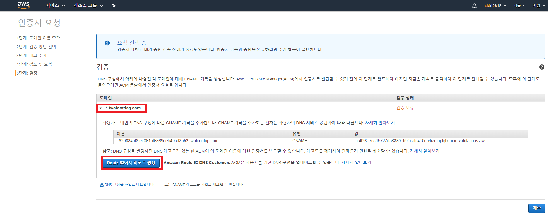 태그 추가 및 검토 및 요청을 하게 되면 다음과 같은 화면이 뜨게 된다. 도메인 주소 클릭 후 Route 53에서 레코드 생성 버튼을 클릭하자.