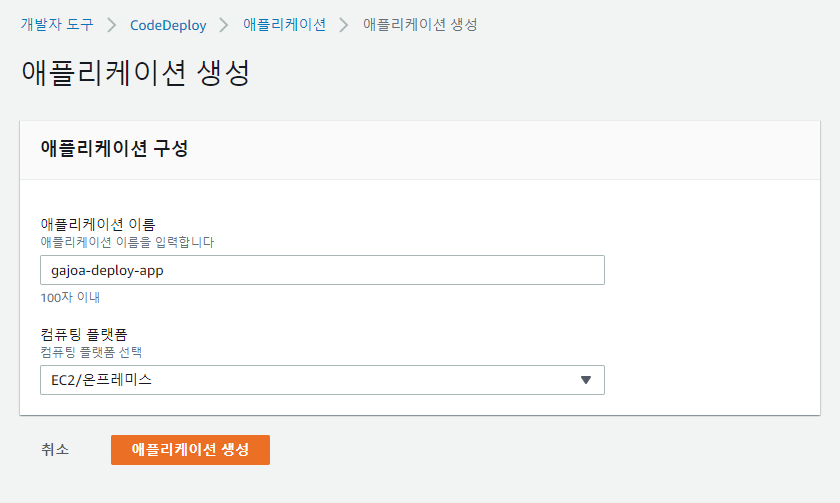 CodoDeploy Agent도 설치를 완료했으니 이제 AWS CodeDeploy를 만들어보자. AWS 홈페이지에서 [콘솔에 로그인] -> [CodeDeploy] -> [애플리케이션] -> [애플리케이션 생성]을 선택한다. 애플리케이션 구성에서 이름과 컴퓨팅 플랫폼을 선택한다. 필자는 EC2에 배포할 것이기 때문에 컴퓨팅 플랫폼은 EC2/온프레미스를 선택했다.
