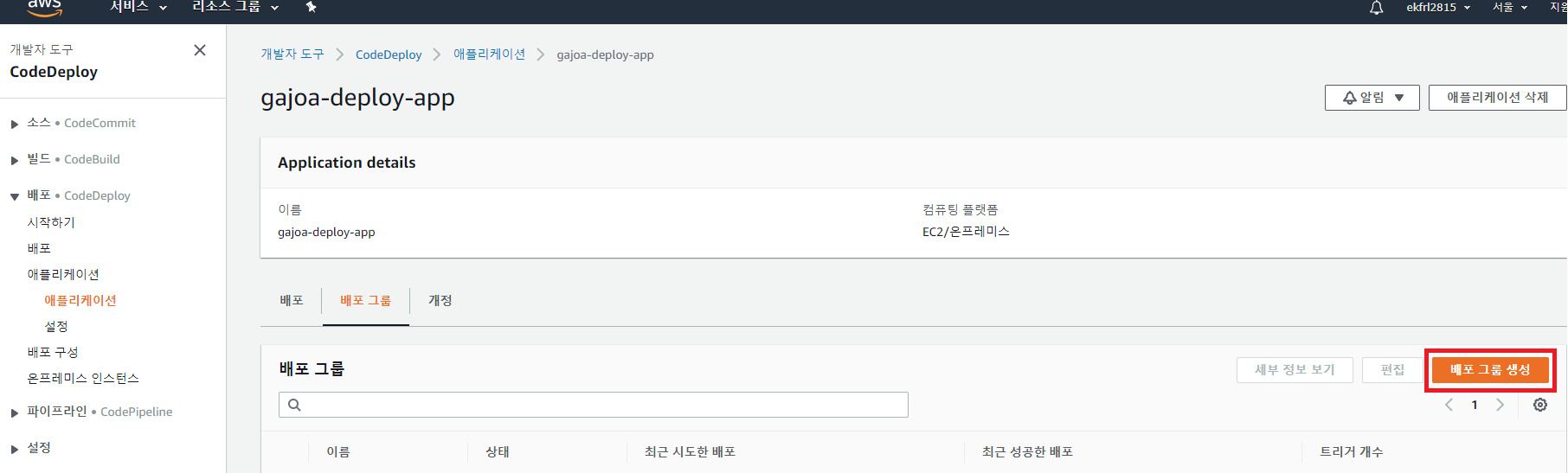 그러면 다음과 같이 배포그룹이 생성이 된다. 해당 배포그룹을 선택한 후 [배포]를 생성하면 배포가 시작된다. 하지만 배포를 시작하기 전 해야 할 일이 있다. 바로 appspec을 만드는 일이다.