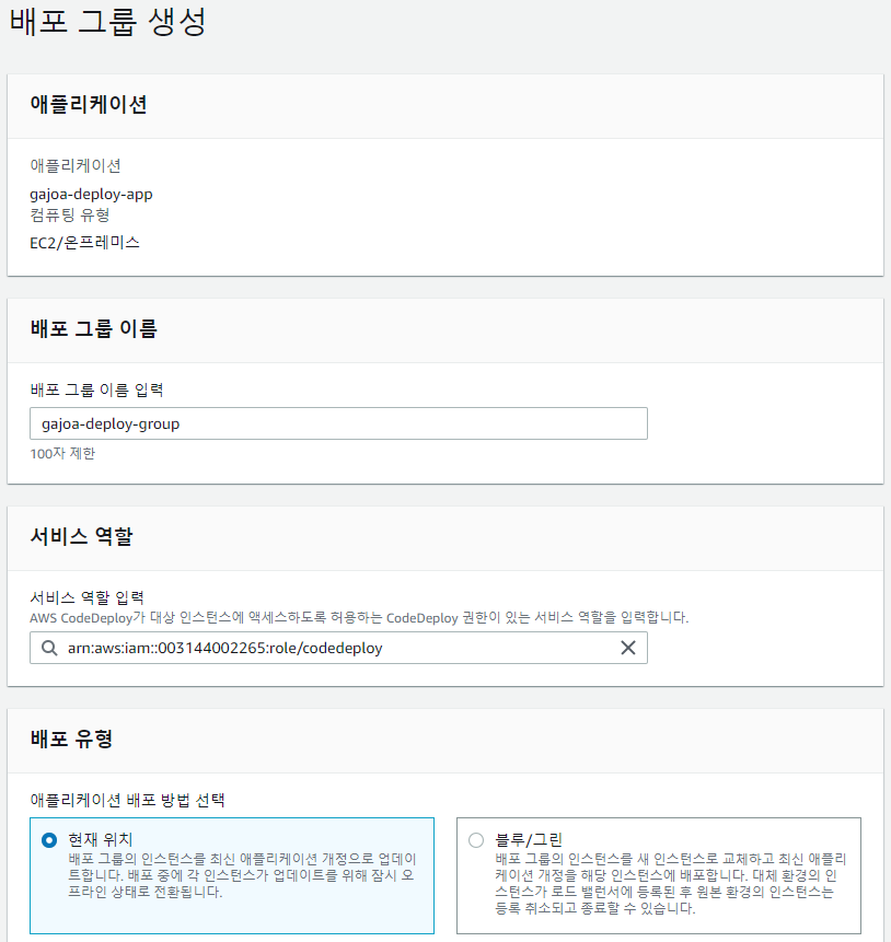 [배포 그룹 이름]에는 원하는 배포그룹명을 넣어주고, [서비스 역할]에서는 맨 처음에 만들어준 IAM역할 중 codedeploy 용으로 만들어준 역할(이 글에선 역할명이 codedeploy 임)을 넣어주고, [배포 유형]은 [현재 위치]를 선택한다.