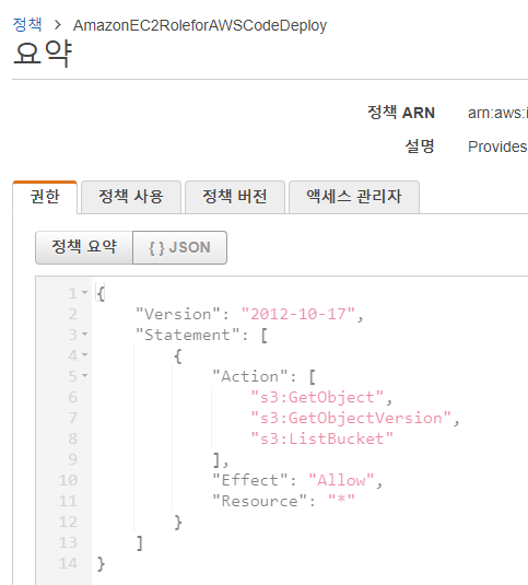 [권한 정책 연결]에서 "AmazonEC2RoleforAWSCodeDeploy" 를 선택한다. 해당 정책을 열어보면 S3를 접근하는 내용의 정책인 걸 확인할 수 있다.