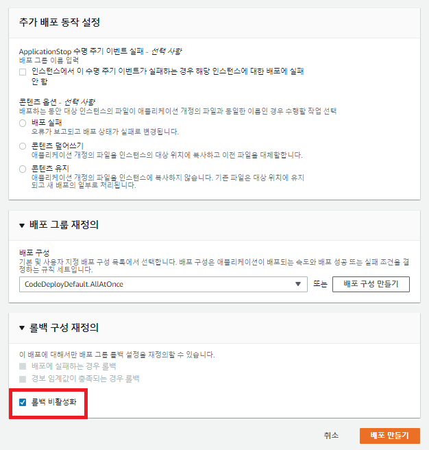 그리고 그 밑에 [롤백 구성 재정의]에서는 롤백 비활성화를 체크해준다(우선 테스트니깐). 다 설정했으면 [배포 만들기]를 클릭해서 배포 결과를 확인해보자.