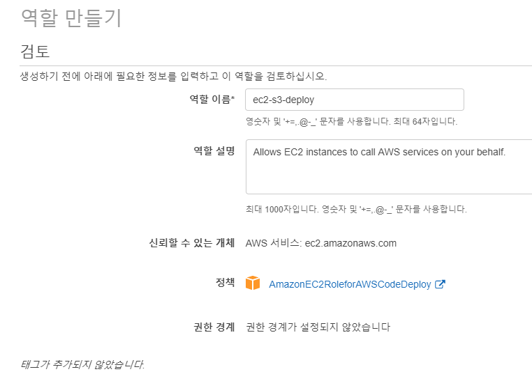 역할명은 ec2-s3-deploy로 작성하고 역할을 생성하자.