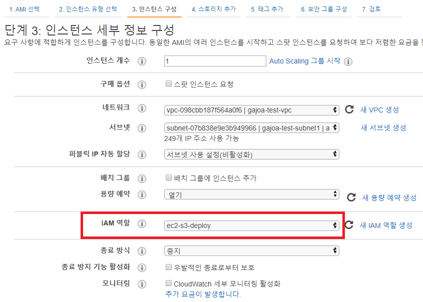 EC2인스턴스 생성하는 방법은 https://twofootdog.tistory.com/27 에서 확인 가능하다. 단 생성할 때 역할을 조금 전 생성했던 ec2-s3-deploy(S3에 접근 가능한 권한)을 주면 된다. 또한 CodeDeploy에서 해당 EC2 인스턴스를 배포 인스턴스로 선택할 때 태그 입력하는 내용이 있기 때문에 5. 태그추가에서도 태그를 추가해주도록 하자(필자는 name : ec2-instance1으로 태그를 추가했다)