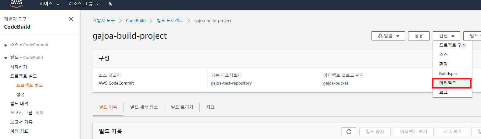 AWS 홈페이지에서 [콘솔에 로그인] -> [CodeBuild] -> [프로젝트 빌드] -> [본인이 생성한 프로젝트]를 선택한 후 [아티팩트]로 들어간다.