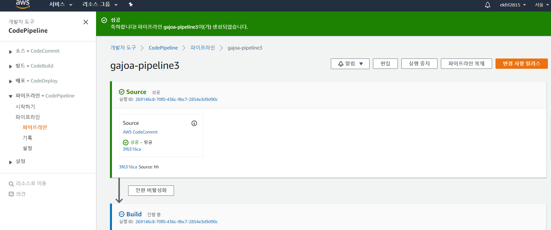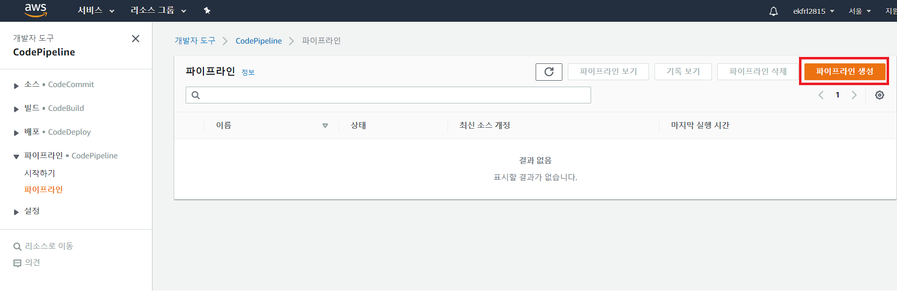 AWS 홈페이지에서 [콘솔에 로그인] -> [CodePipeline] -> [파이프라인 생성] 선택