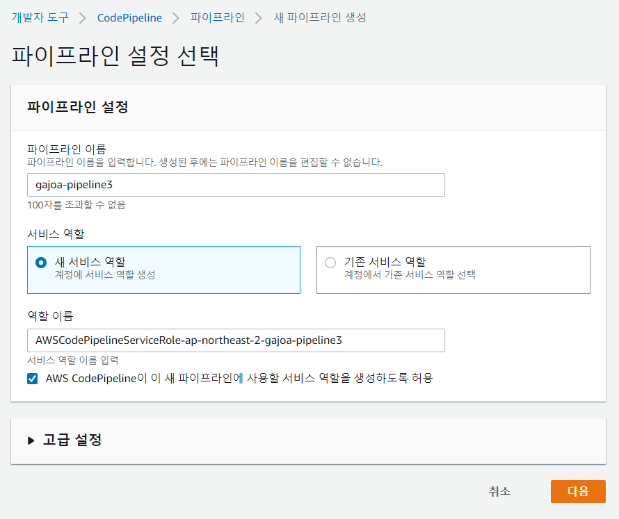 파이프라인 설정에서 [파이프라인 이름]을 입력하고, [서비스 역할]은 [새 서비스 역할]을 선택하여 CodePipeline에 맞는 IAM 역할을 자동으로 생성해준다. 그리고 밑에 [고급 설정]을 클릭한다.