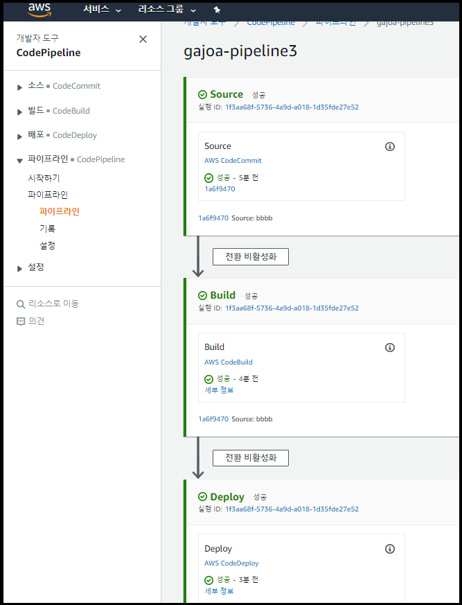 그러면 파이프라인이 생성이 완료되고 자동으로 CodeCommit에 있는 소스가 CodeBuild와 CodeDeploy를 거쳐 소스가 EC2 인스턴스에 배포된다.