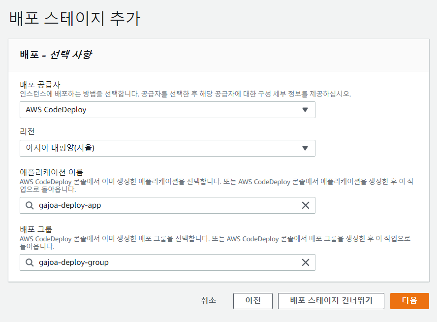 [배포 스테이지 추가]에서는 인스턴스에 배포하는 방법에 대한 정보를 입력한다. 이 글에서는 이미 AWS CodeDeploy를 만들어 놓았기 때문에 만들어놓은 AWS CodeDeploy를 선택하고 다음으로 넘어간다.