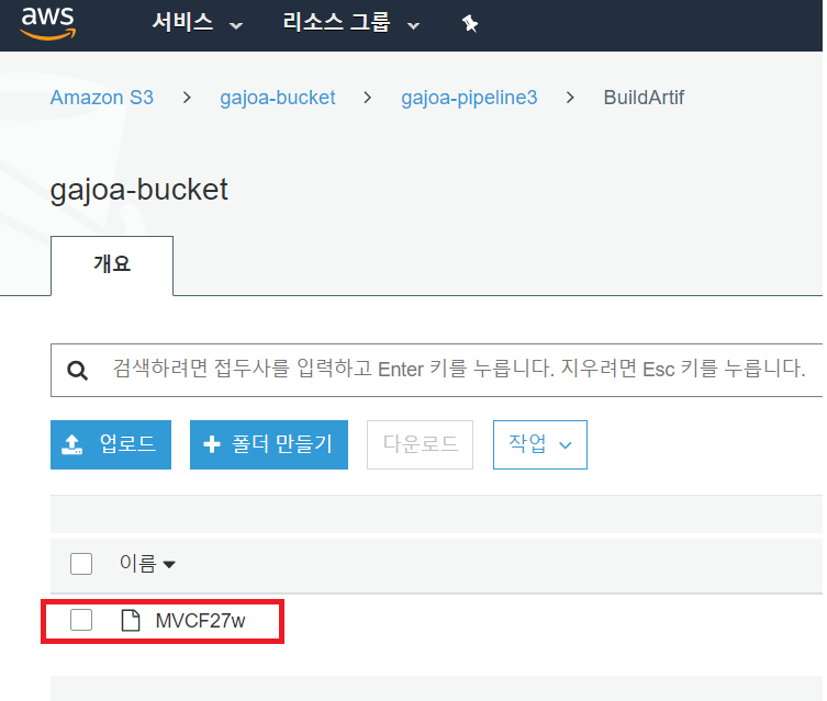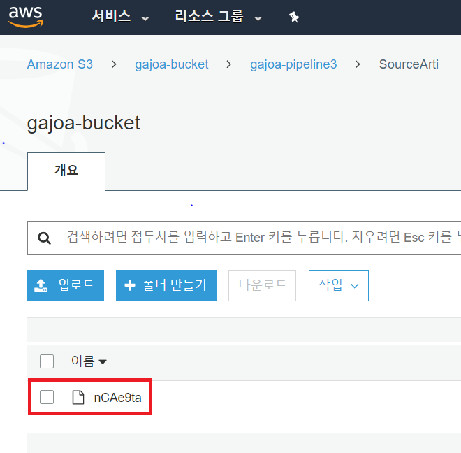 S3 버킷으로 가보면 파이프라인 명으로 신규 디렉토리가 생성되었고, 해당 디렉토리 안에는 빌드 아티팩트 파일과 소스 아티팩트 파일이 암호화 되어 저장된 것을 확인할 수 있다.