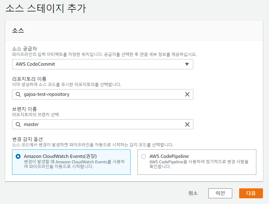 - [리포지토리 이름] : 소스 저장소의 이름이다. CodeCommit의 이름을 선택한다.