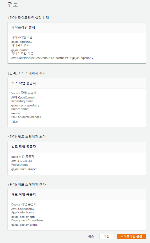 [검토]에서는 지금까지 설정해 놓은 정보를 확인한다. 정보가 맞으면 [파이프라인 생성] 버튼을 클릭해서 파이프라인을 생성한다.