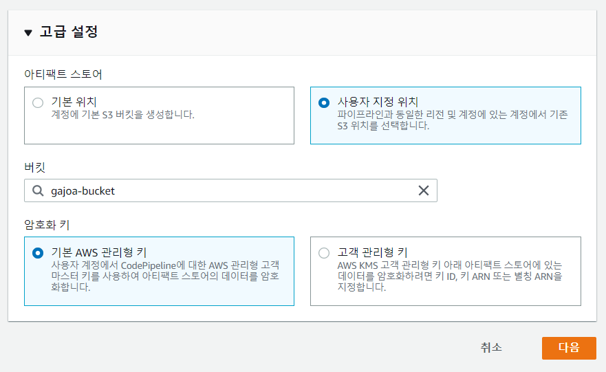 [고급 설정]에서는 아티팩트 저장소를 지정하는데, [기본 위치]를 선택할 경우 새로운 S3 버킷을 자동으로 생성해주며, [사용자 지정 위치]를 선택할 경우 미리 만들어 놓은 버킷을 선택할 수 있다. 이 글에서는 S3 버킷을 이미 만들어 놨기 때문에 [사용자 지정 위치]를 선택한 후 버킷 명을 선태한다. [암호화 키]는 [기본 AWS 관리형 키]를 선택한 후 다음으로 넘어간다.