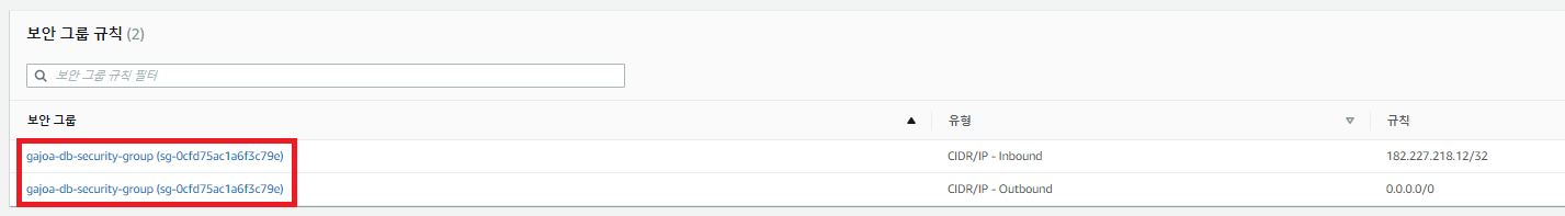 추가적으로 할 일은 생성한 RDS에 접속하기 위해 해당 보안 그룹에 접속할 source의 정보를 입력해야 한다.(로컬PC 및 EC2 인스턴스)