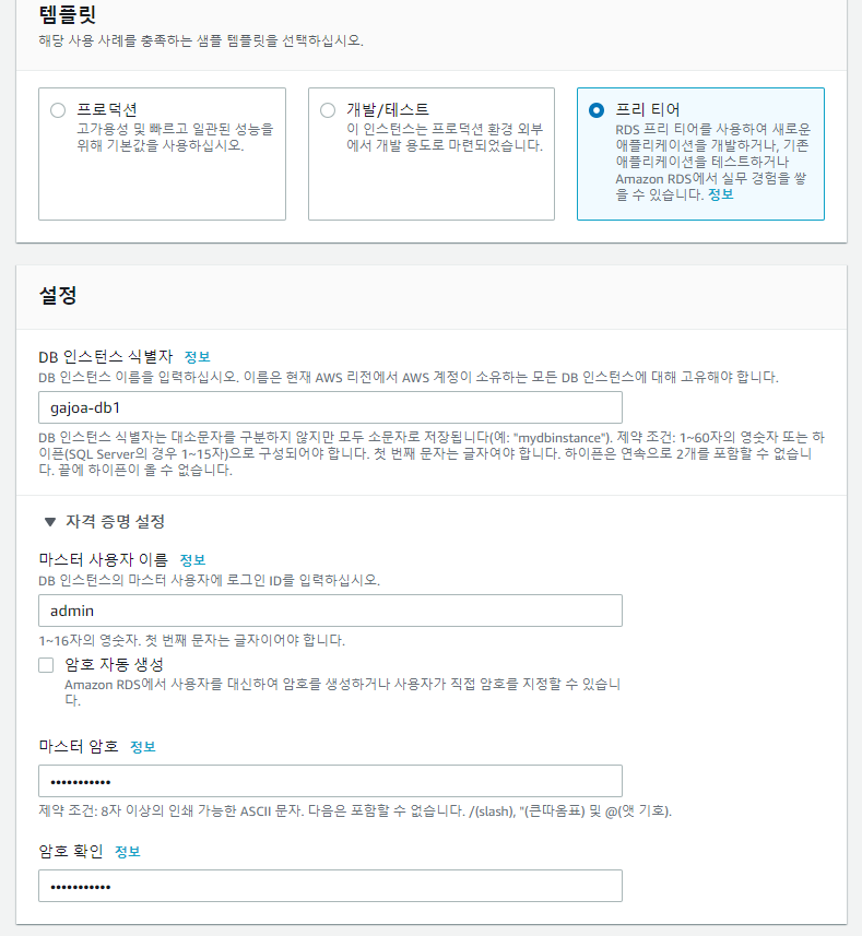 [템플릿]에서는 [프리 티어]를 선택하고, [DB 인스턴스 식별자]에서는 DB명을 임의로 넣어주고, [마스터 사용자 이름]과 [마스터 암호]에 원하는 이름과 암호를 넣어준다.