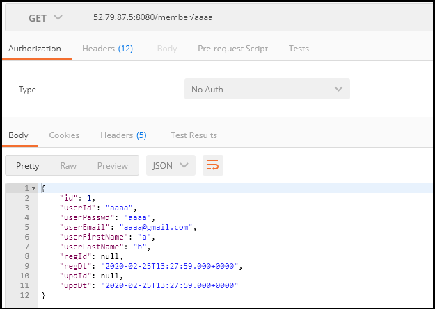 위와 같이 작성한 후 빌드한 다음 생성된 jar파일을 EC2 인스턴스에 올려서 java -jar 명령어로 서비스를 수행하거나, 로컬PC와 연동된 CodePipeline이 생성되어 있으면 CodeCommit으로 소스를 push하게 되면 해당 스프링부트 서비스는 수행하게 된다. 해당 스프링부트 서비스가 수행하게 되면 RDS와 연동하여 데이터를 정상적으로 조회해 오는것을 확인할 수 있다.