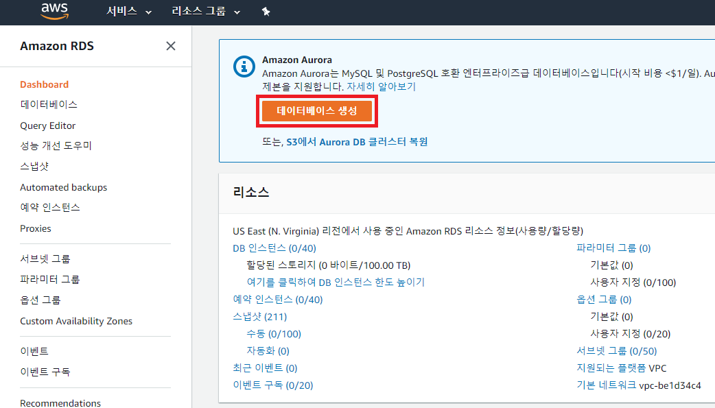AWS 홈페이지에서 [콘솔에 로그인] -> [RDS] -> [Dashboard] -> [데이터베이스 생성]을 선택한다.
