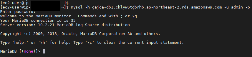 다음으로 EC2 인스턴스에서 RDS로 접근해보자. 정상적으로 접근이 된다. EC2 인스턴스 -> RDS 연결도 성공이다.