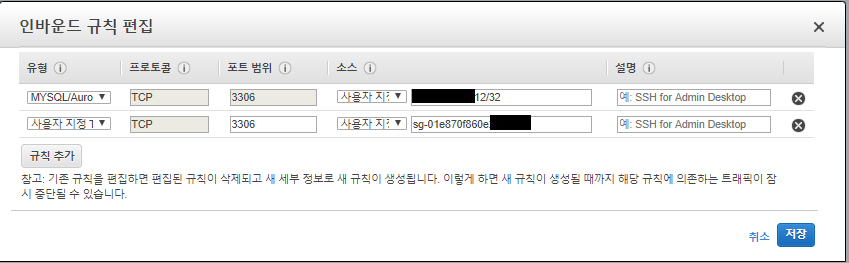 보안그룹에서 [인바운드]탭을 클릭하고 [편집]버튼을 누른다. 그리고 해당 RDS에 접속할 source의 정보를 넣어준다. 첫번째 줄은 필자의 로컬PC 주소이고, 두번째 줄은 RDS에 접근할 EC2 인스턴스가 속해있는 보안그룹의 그룹ID다.