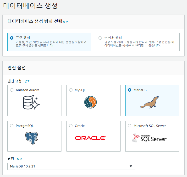 [데이터베이스 생성 방식 선택]에서는 [표준 생성]을 선택하고, [엔진 유형]에서는 [MariaDB]를 선택하고 밑에 [버전]을 선택한다.