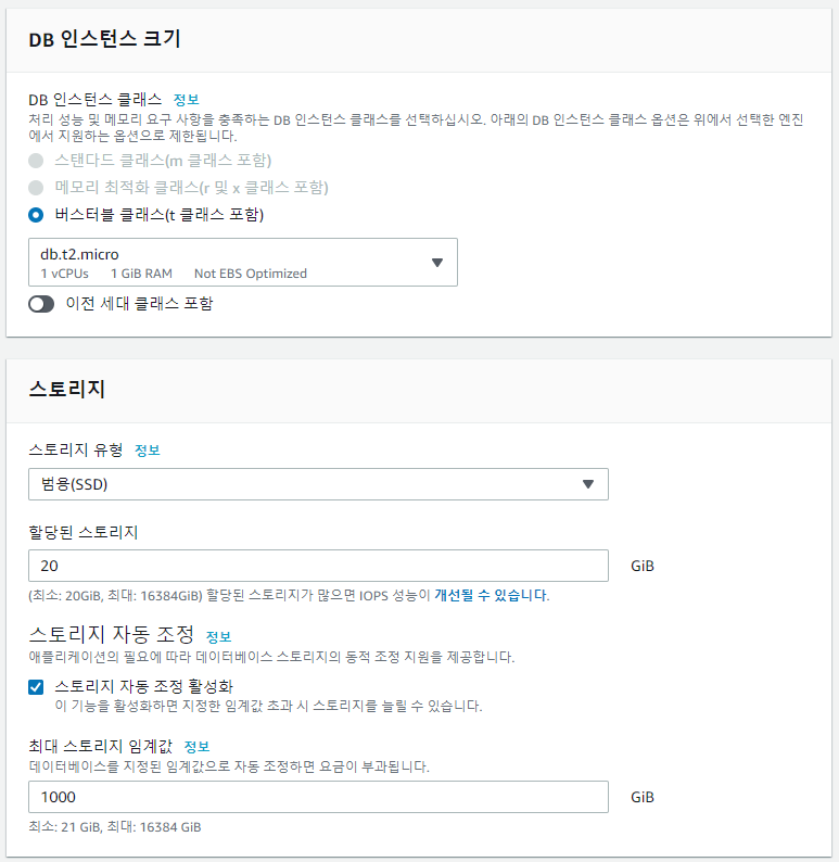 [DB 인스턴스 크기]와 [스토리지] 모두 기본값으로 설정한다(프리티어니깐 ㅠ).